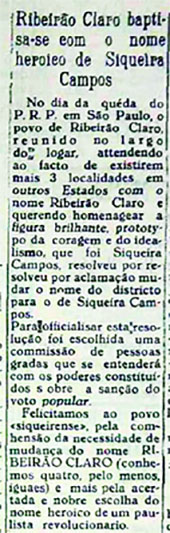 Para comemorar a queda do Partido Republicano Paulista – PRP e do presidente Washington Luís, no dia 27 de outubro de 1930, os cidadãos vitoriosos de Ribeirão Claro decidiram mudar o nome do povoado para Siqueira Campos.